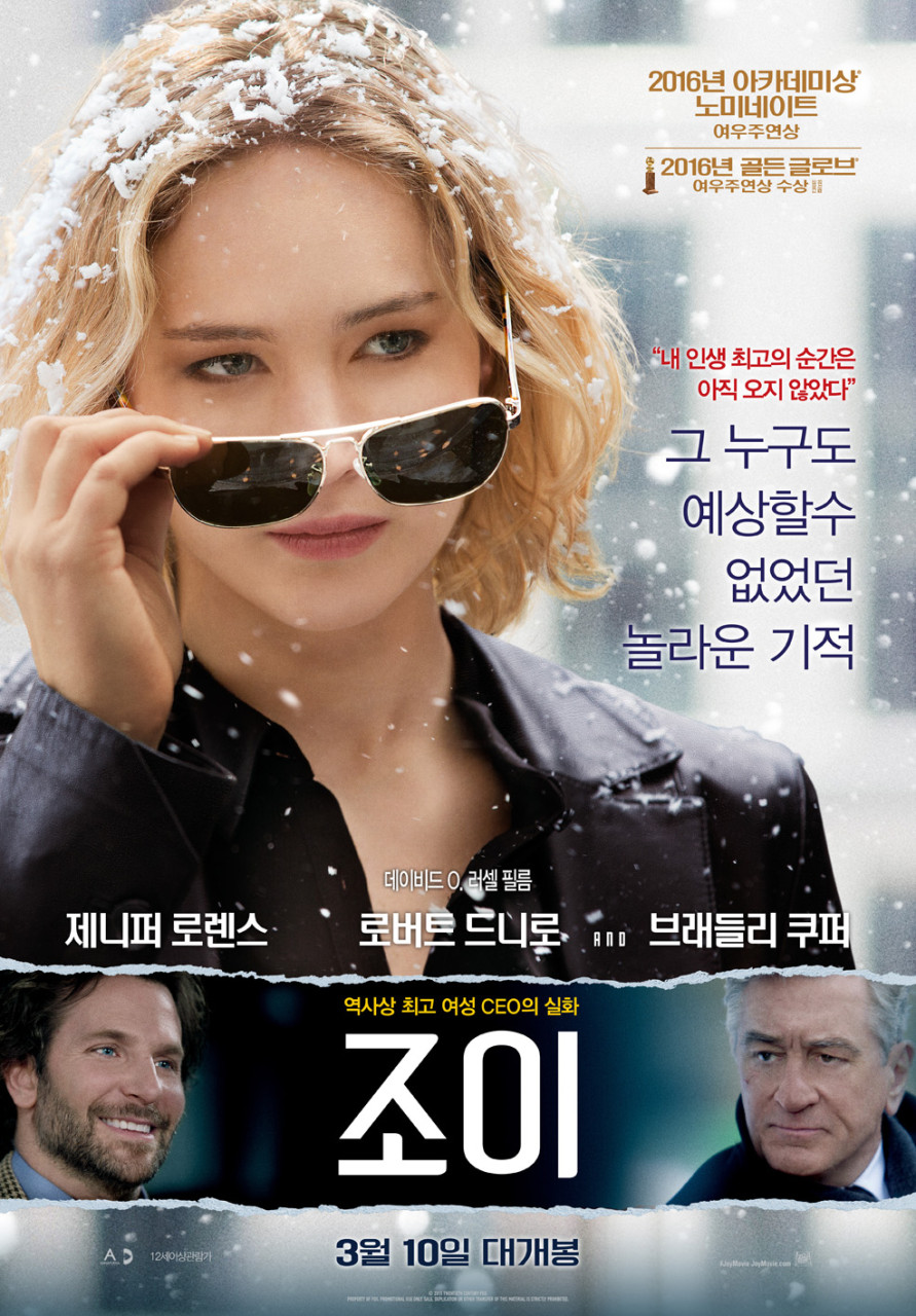 《조이》()는 2015년 공개된 데이비드 오 감독의 전기 코미디 드라마 영화이다. 러셀. 이 영화는 이혼한 두 아이의 엄마인 조이 만가노가 스스로 주름잡는 걸레를 발명하고 성공적인 기업가로 성장하는 이야기를 다룬다. 이 영화의 배경은 1980년대와 1990년대로, 조이가 그녀의 아이들, 그녀의 어머니, 그리고 그녀의 전 남편을 돌보면서 먹고 살기 위해 고군분투하는 시기이다. 어려움에도 불구하고, 조이는 그녀 자신을 성공시키고 그녀의 가족을 위해 더 나은 삶을 만들기로 결심했다. 어느 날, 흘린 물을 치우는 동안, 조이는 바닥을 닦는 더 나은 방법이 있을 것이라는 것을 깨닫는다. 그녀는 자신이 개발하고 특허를 낸 스스로 주름을 잡는 걸레에 대한 아이디어를 생각해냅니다. 그러나 성공을 향한 조이의 여정은 순탄한 항해와는 거리가 멀다. 그녀는 치열한 사업의 세계를 항해하고 그것에 수반되는 배신과 장애물에 대처해야 한다. 조이의 성공을 향한 여정은 종종 그녀의 친절한 성격을 이용하는 그녀의 기능 장애가 있는 가족에 의해 더욱 복잡해진다. 그녀의 아버지 루디는 무모한 몽상가로, 그녀의 이복 여동생 페기는 조이의 성공을 질투하고 매 순간마다 그녀를 방해하려 한다. 이러한 도전에도 불구하고, Joy는 인내심을 가지고 QVC에서 그녀의 걸레를 판매하여 하룻밤 사이에 센세이션을 일으킨다. 그러나 그녀의 성공은 그녀가 법적인 도전에 직면하고 그녀의 사업을 유지하기 위해 고군분투하기 때문에 대가가 없는 것은 아니다. 영화 내내 조이는 반대와 배신에 직면해서도 스스로를 옹호하고 자신의 가치를 주장하는 법을 배운다. 그녀는 또한 아버지와 화해하고 새로운 사랑을 찾으며 역경 앞에서 강인함과 회복력을 보여준다. 전반적으로, "조이"는 성공을 달성하고 자신과 가족을 위해 더 나은 삶을 만들기 위해 역경을 극복하는 한 여성의 가슴 따뜻하고 영감을 주는 이야기이다.